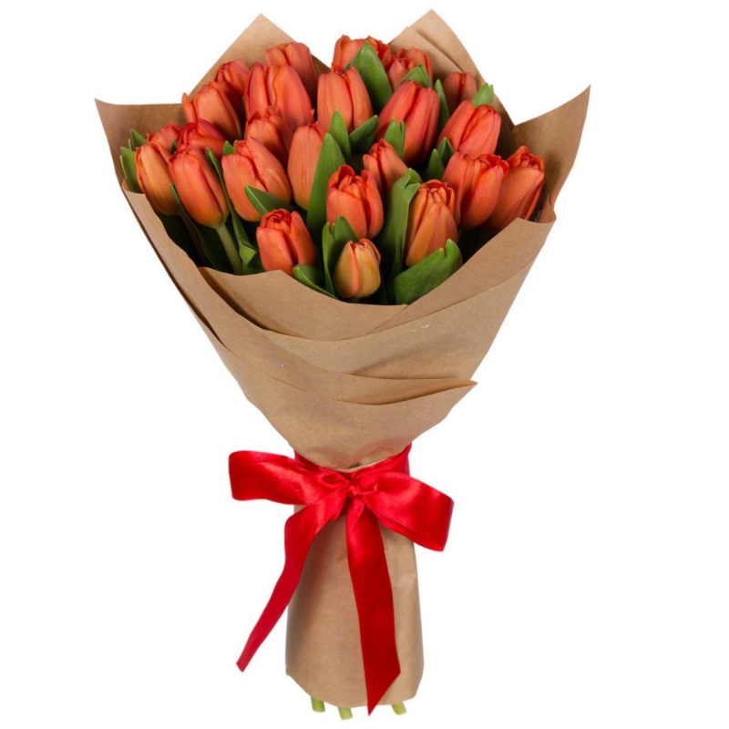 Букет состоит из 25 красных тюльпанов, крафт, атласная лента.